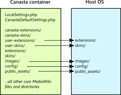Being a Docker image, Canasta places some files and directories in the host operating system as bind mounts — files and directories associated with the image but which are not contained in the Docker image's container itself, and which the administrator can thus modify, because they will not be removed or overwritten if the Docker image is updated. Canasta also stores the database outside of the Docker container, although this is stored as a volume (named "mysql-data-volume") and not a bind mount.